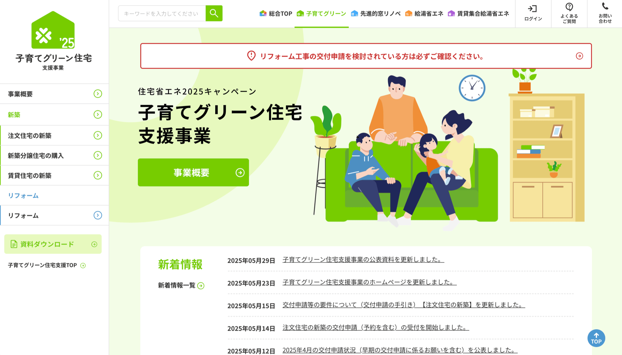 2024年度の「子育てエコホーム支援事業」の後継となる制度で、2025年度は「子育てグリーン住宅支援事業」として実施されます。名前に「子育て」とありますが、すべての世帯が利用できる区分もありますので、お気軽にご相談ください。