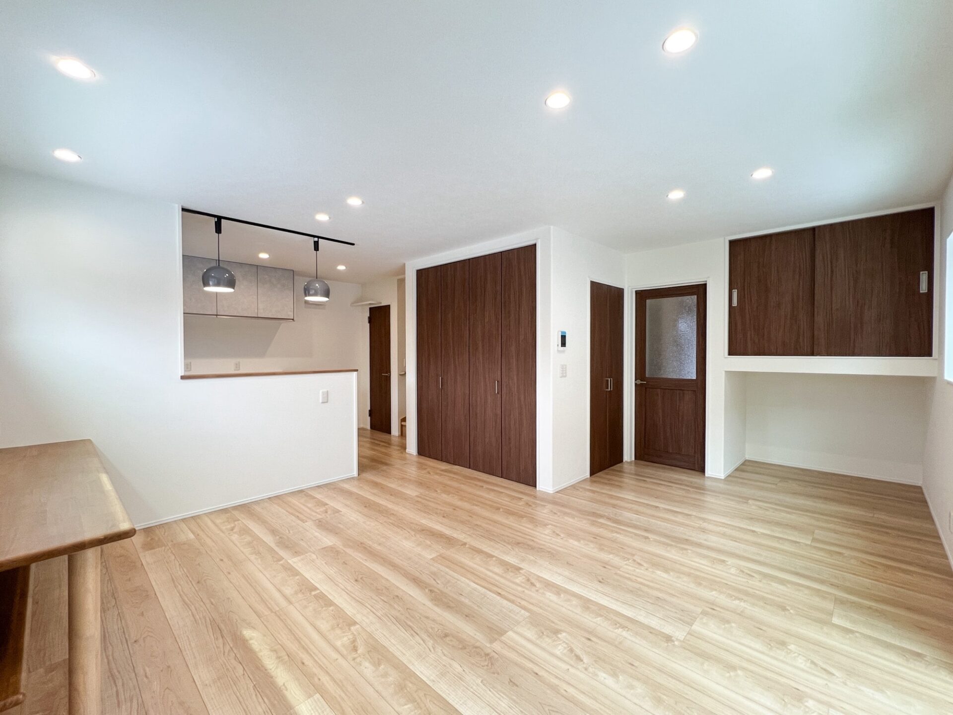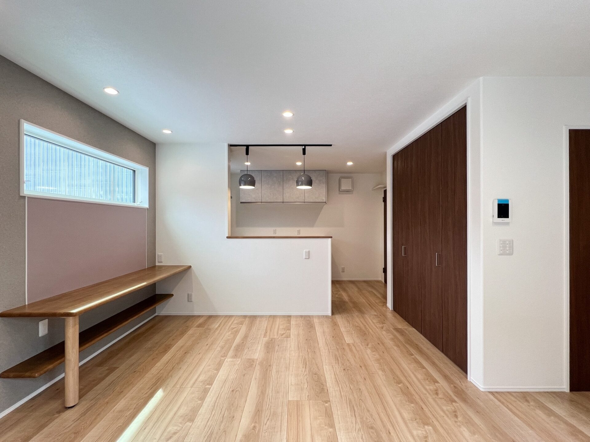 リビングアクセス階段や、リビング学習にもぴったりな収納棚付きの多目的カウンターと、マグネット式のアクセントボードなどを採用されています。