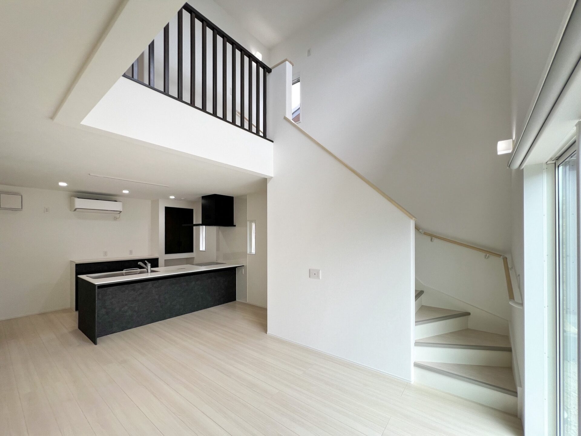 リビングに大きな吹き抜けを採用した開放的な空間が特徴です。