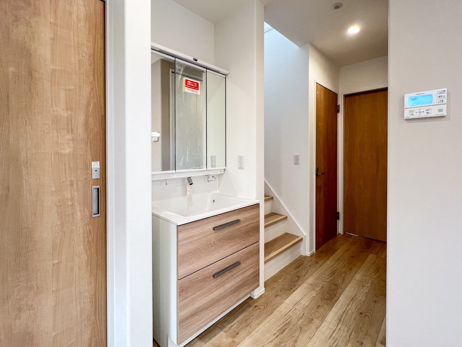 洗面化粧台へと続き、「ただいま手洗い」にも便利!