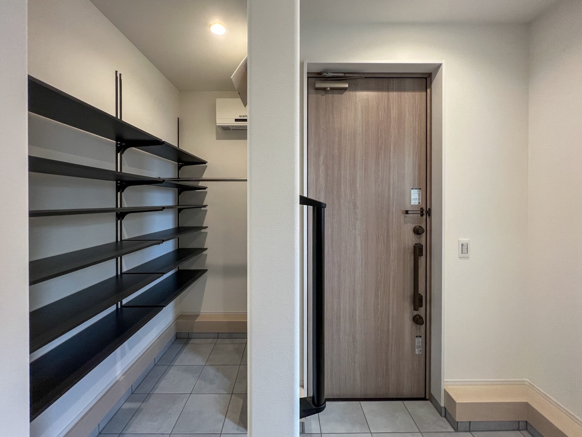 帰宅した際に、着ていた上着を脱いで収納しながら、そのまま洗面所を通って「おかえり手洗い」が叶う動線と、玄関から直接リビングに向かう動線の2つがあります。