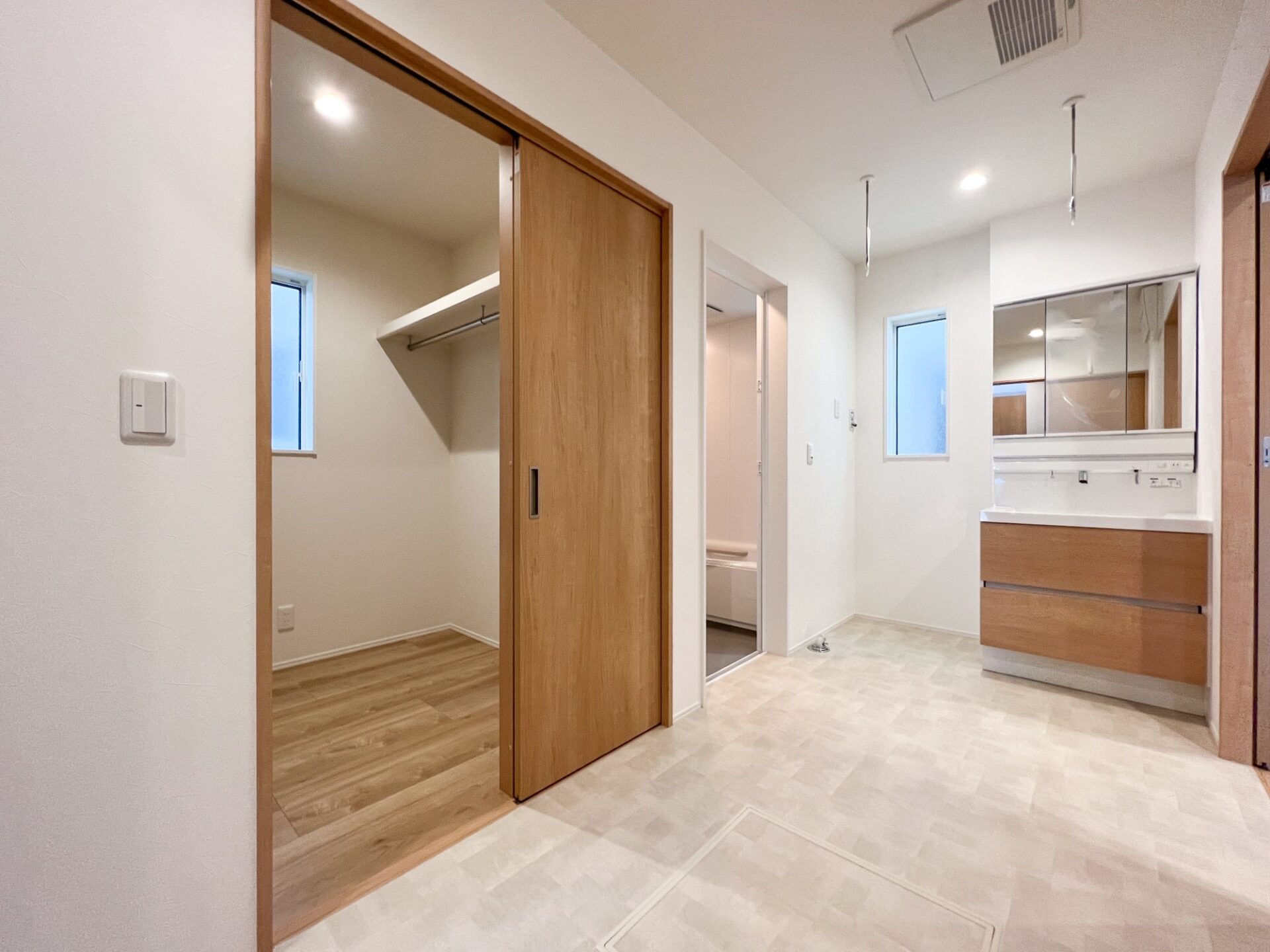 外でいっぱい遊んで帰っても、玄関から浴室や洗面台に直行できます!