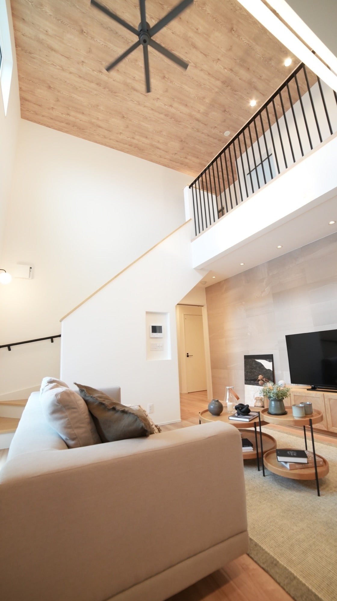 大開口の窓と、2階の廊下に面した吹き抜けが抜群の開放感を生み、