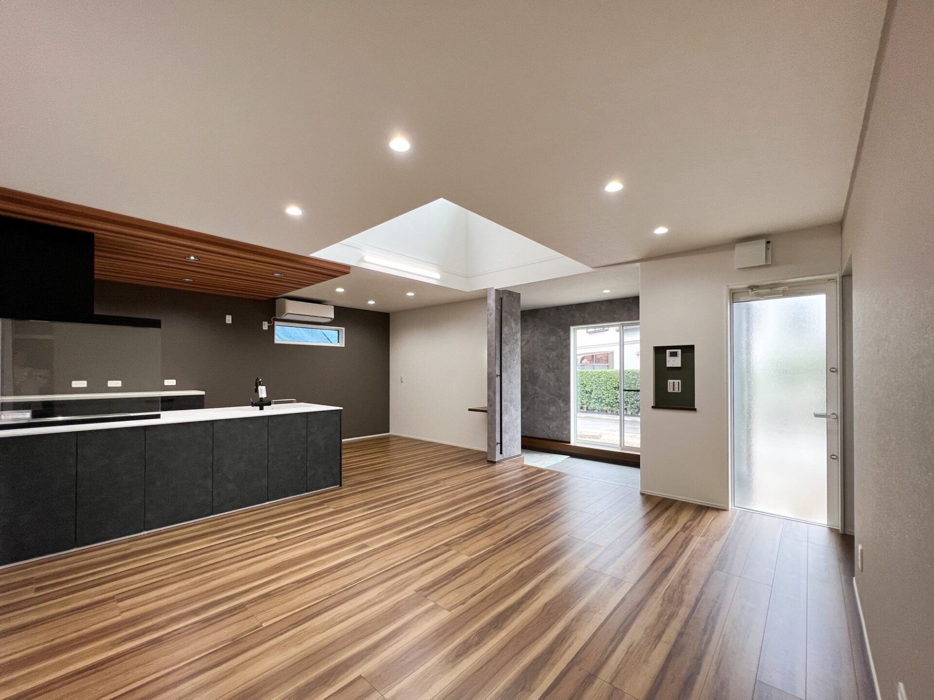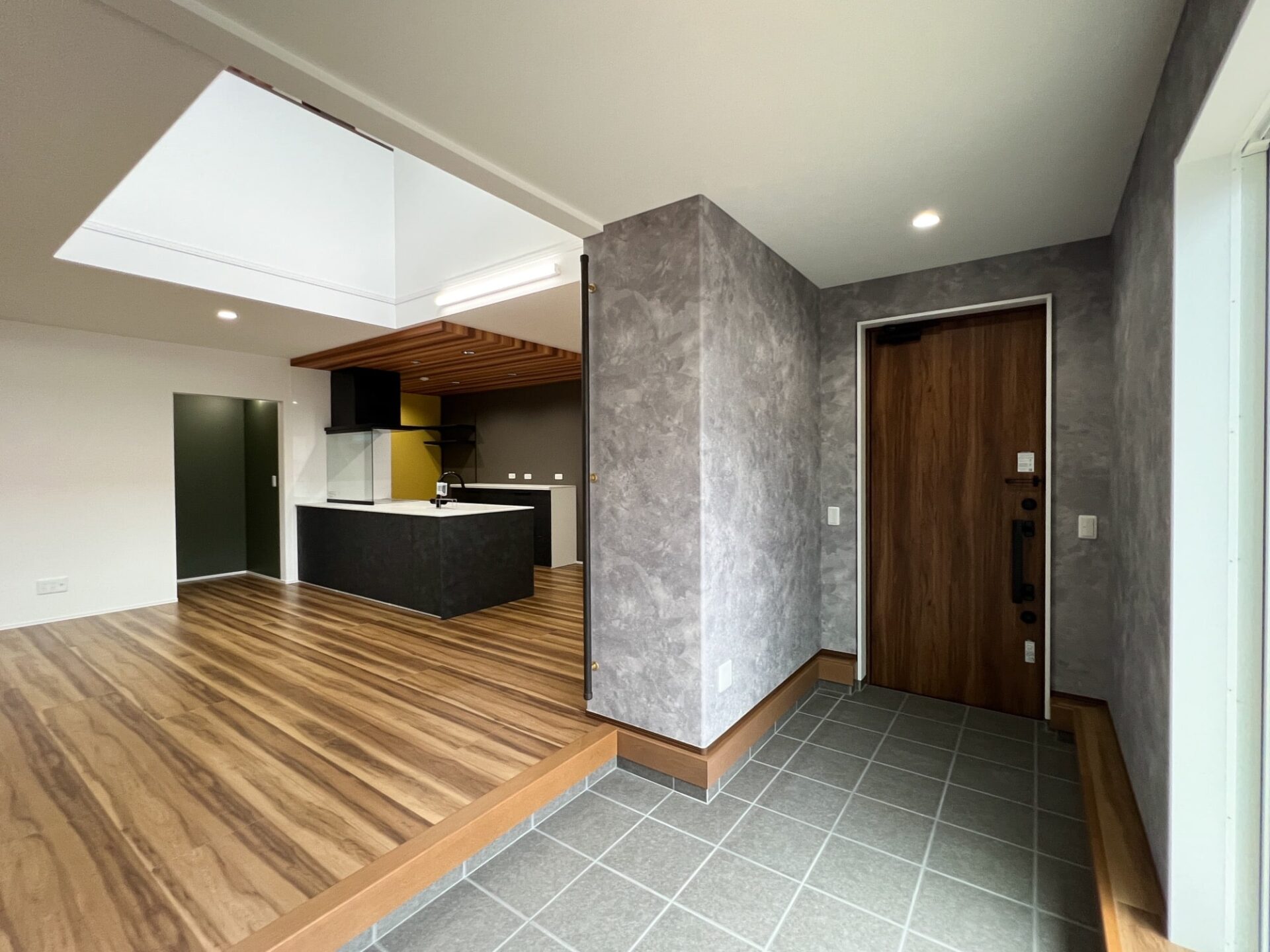 リビングと直接つながっている、広い間口が開放的な玄関土間が特徴です。