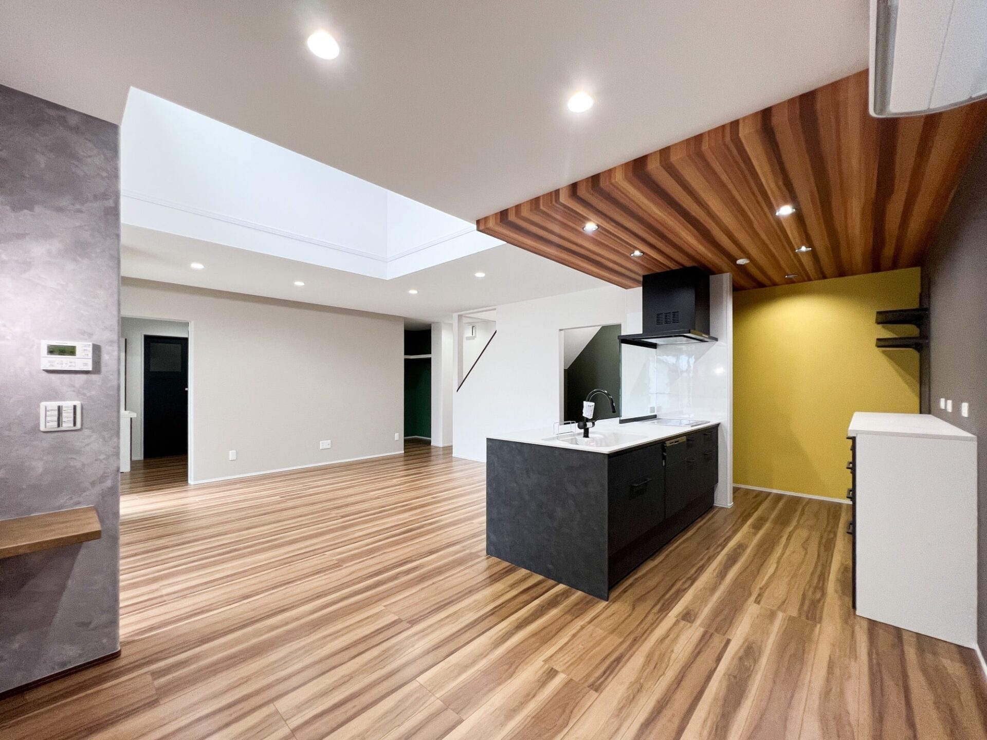 キッチンは木目調の下がり天井×グレーとマスタードカラーが調和しています。