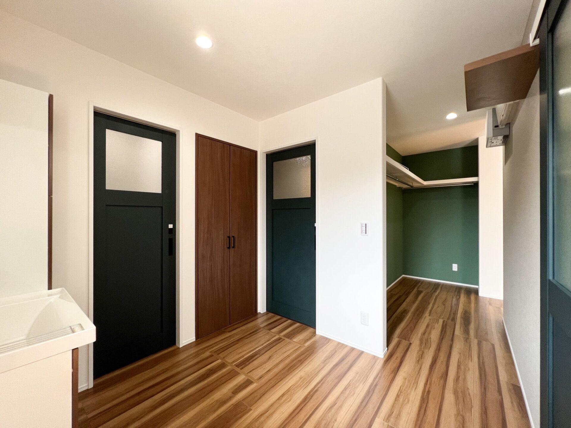 トイレや浴室、ユーティリティの引き戸はヴィンテージ調の深いグリーンで合わせています。