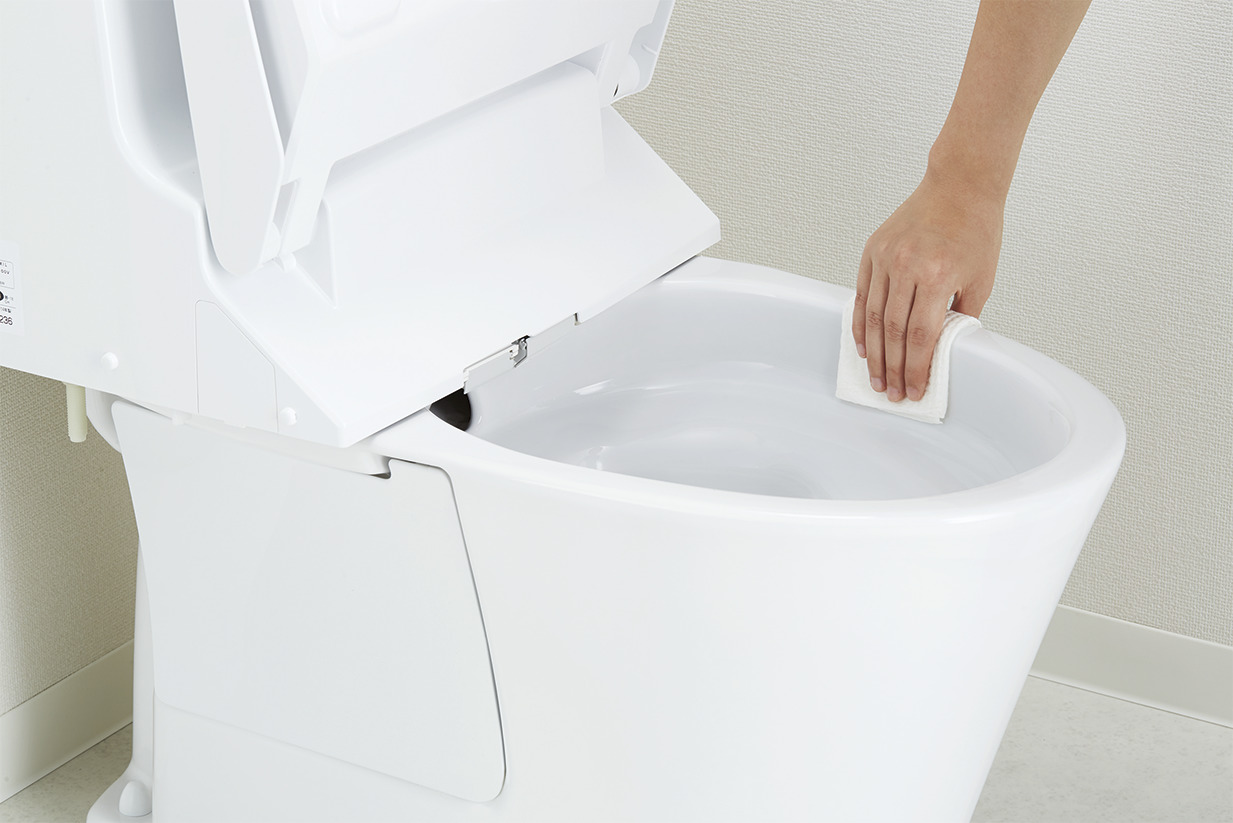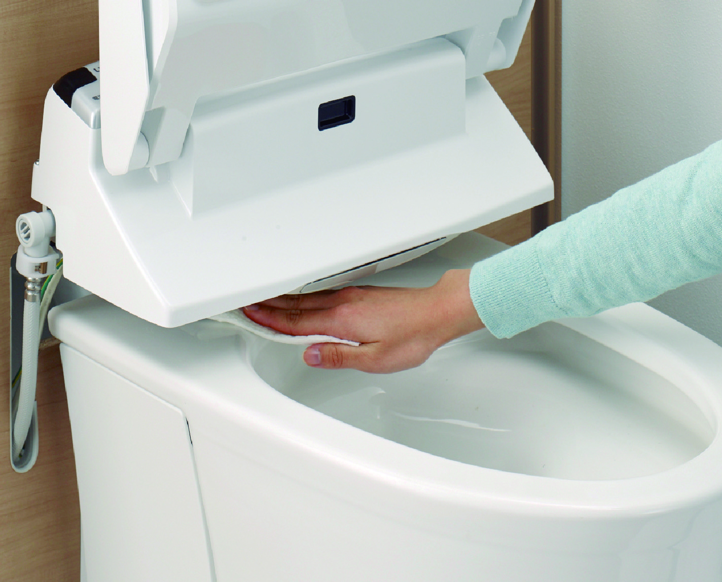 タックレスのすっきりしたデザインで、すき間の奥までしっかり掃除ができる「電動お掃除リフトアップ」機能や、便座のつぎ目・便器のフチをなくした拭き掃除がしやすい形状など、日々のお手入れが格段に楽になりますよ!