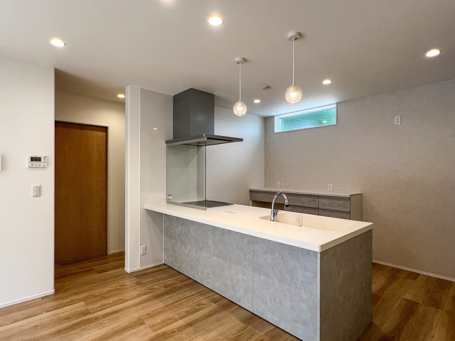 コンロの前をガラス張りにすることで、明るさと開放感をキープ。