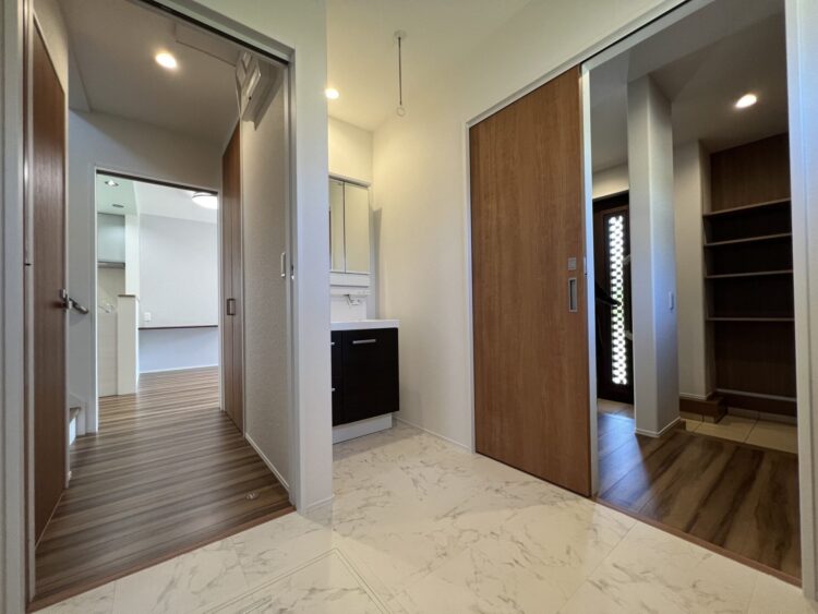 お子さまを出迎える玄関近くに手洗い・うがいができる洗面台を設けて、