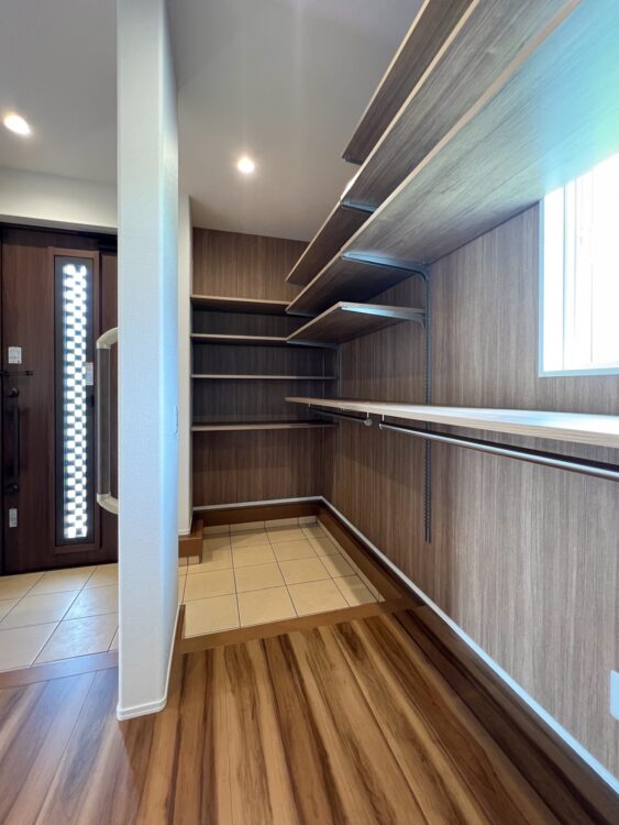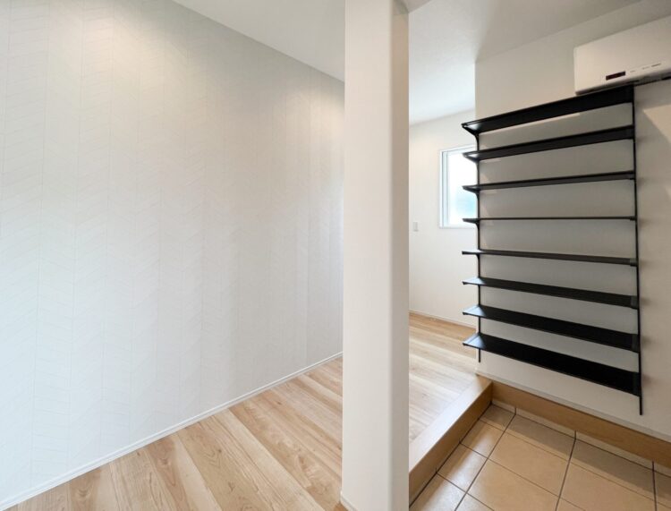 玄関に大きな靴箱を設けると手狭になりますが、余分な靴を土間収納に収めることで散らからずにスッキリ。