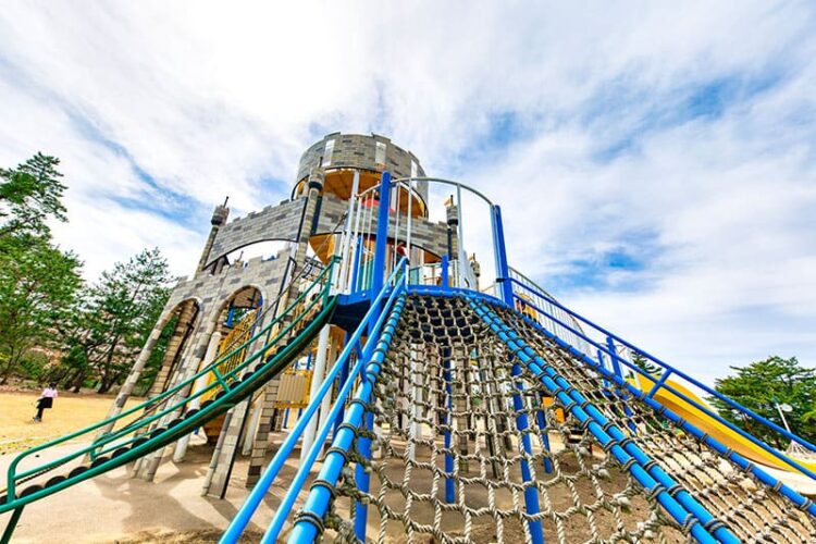 空中回廊遊具や大型木製遊具にお子様たちが大はしゃぎすること
