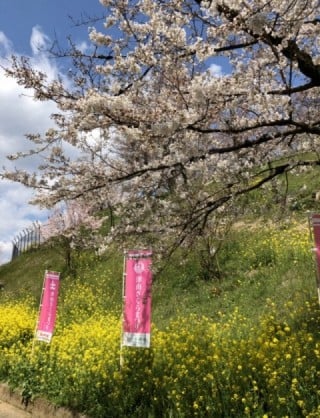 ほぼ満開で青空と桜のピンクと菜の花の黄色のコラボに