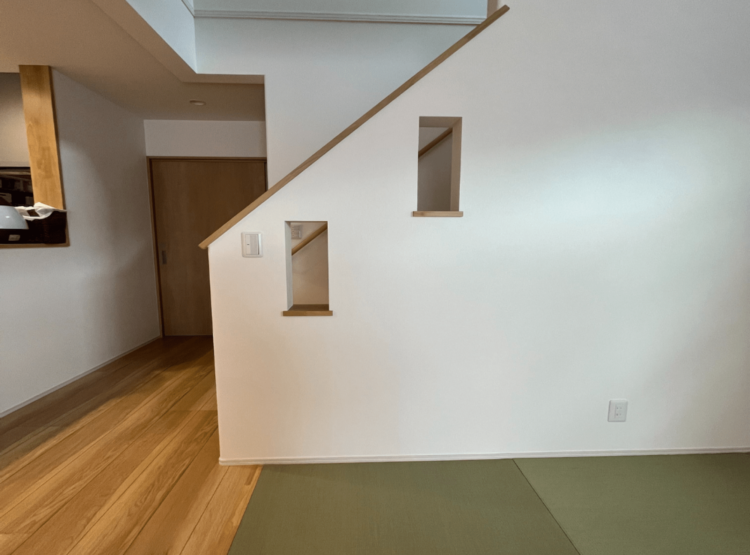 S様:間取りと日当たり、そして動線ですね。とくに、キッチン横からパントリーを通過して、脱衣所へとつながるスムーズな動線が気に入っています。行ったり来たりするストレスがないので、家事効率も上がり、快適ですよ。あと、大工さんにお願いして階段の壁に作ってもらったスリットですね。アクセントとして、畳コーナーをより開放的にするために作ってもらったのですが、とても気に入っています。