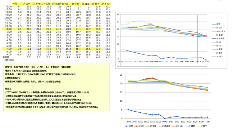 停止直後(夜0時)に各部屋21℃以上だった室温は、最も下がった部屋でも朝7時の時点で16.1℃。