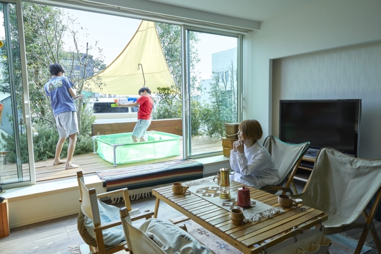 アウトドアリビングだから、ママやパパはソファでリラックス。