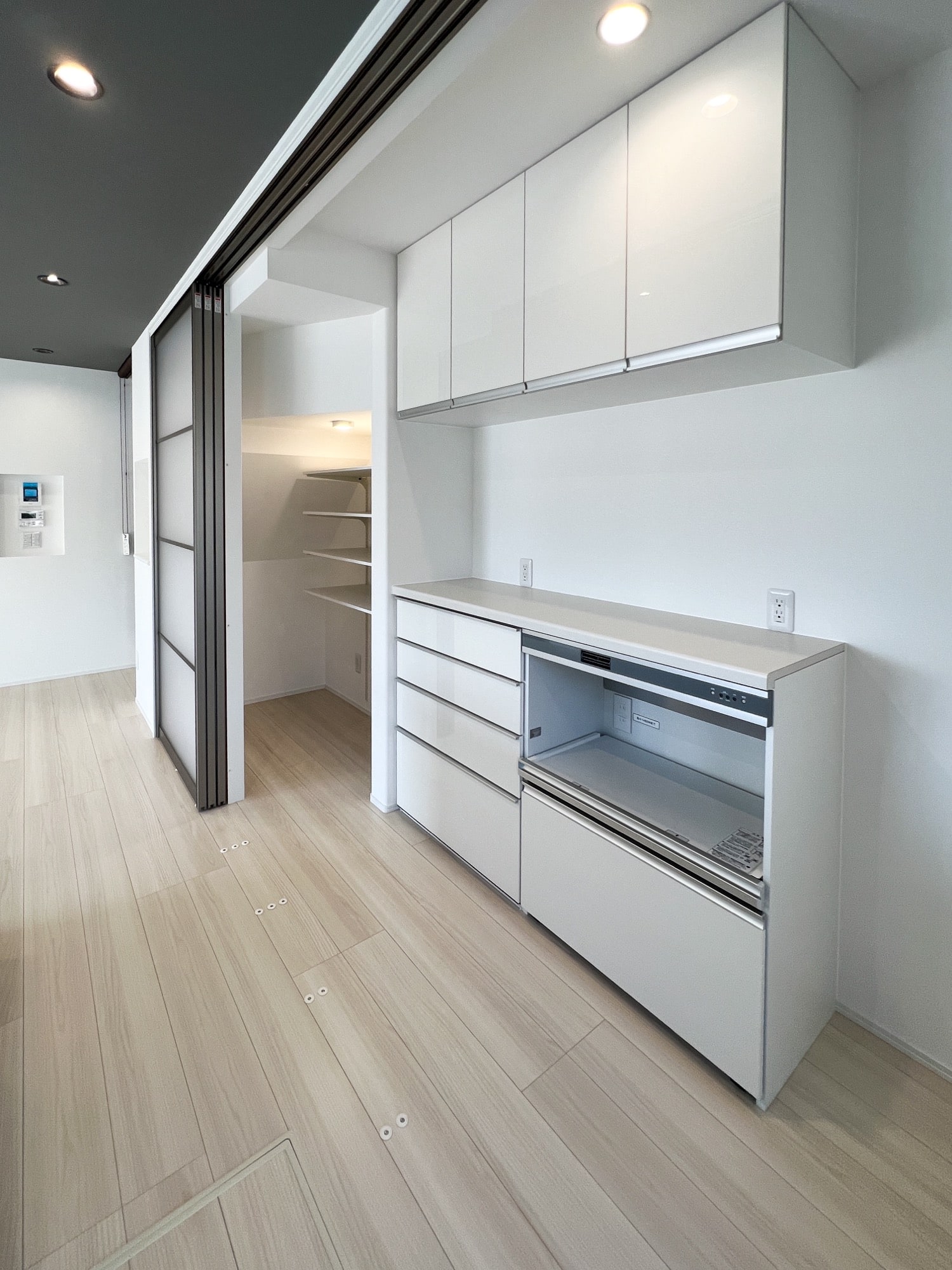 キッチンの背面は、パントリーを備えた大容量の収納と