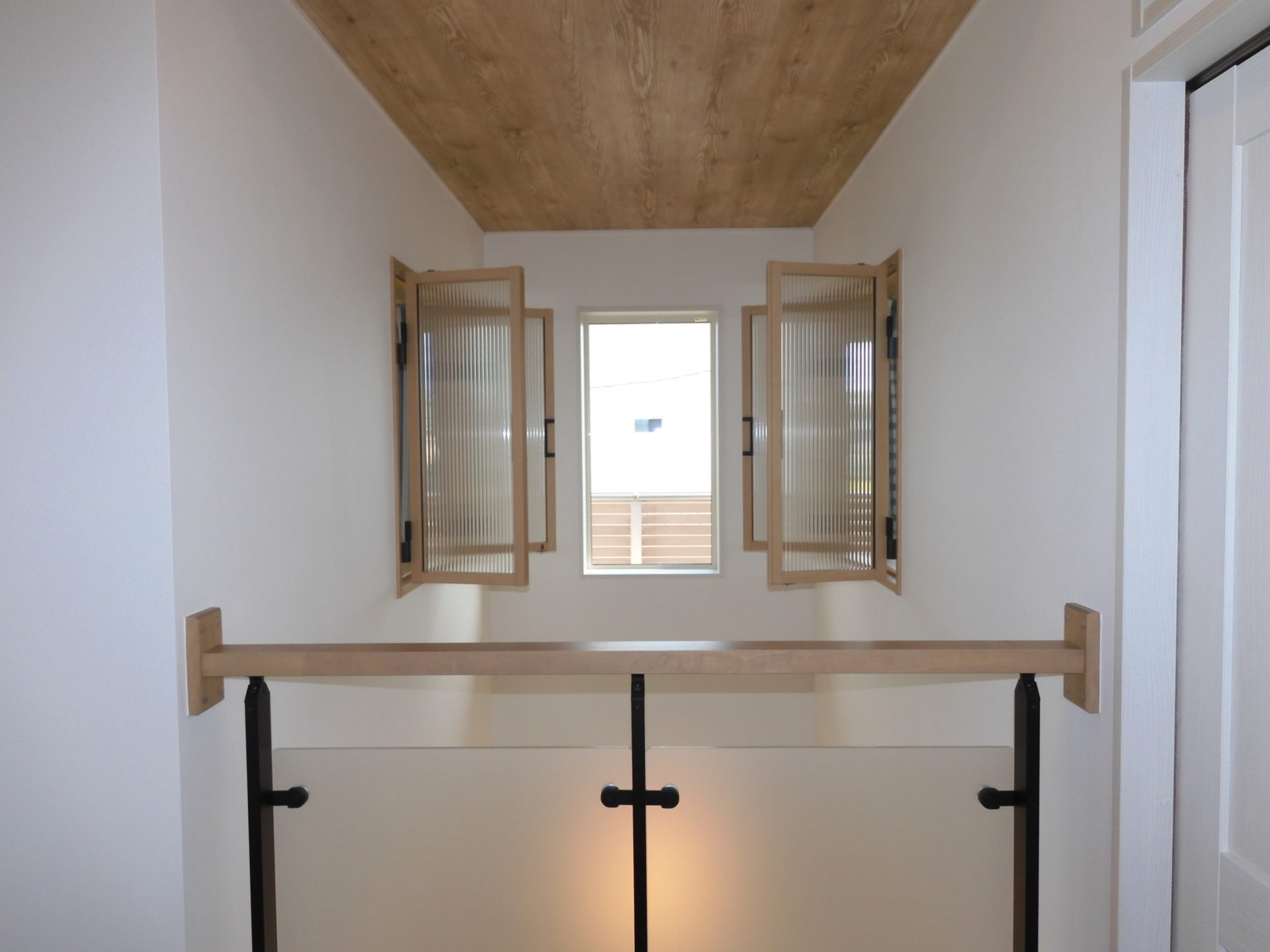 取り付けたのは2階の子ども部屋。内窓を開くと、そこは吹抜になっています。部屋にいながら下にあるリビングの家族の気配を感じられるのが特徴です。向かいの部屋にも同じように取り付けているので、どちらも開けておけば、リビングだけでなく向かいの部屋にいる兄弟の気配も感じられます。お子様が部屋で勉強していても内窓が開いていれば「ごはん出来たよー!!」という声も届くはず。またお部屋のアクセントにもなるので、特に女性のお客様から「これいいなぁ!!」というお声をいただいております。