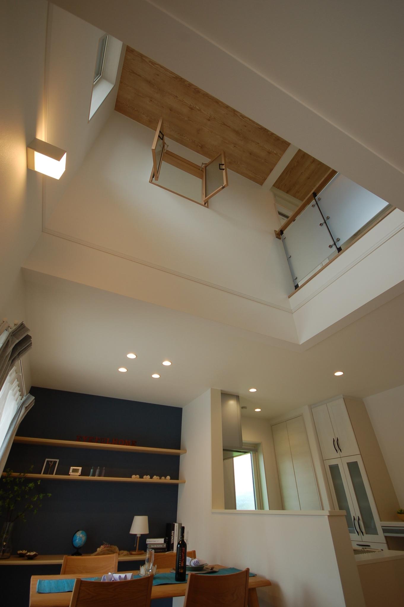 そしてもう一つ重要な役割が…。それは空気の通り道としての役割。エアコン1台で家中快適な温度を保つ事が出来るこのモデルハウス。例えば暖房の温かい空気は上へ上がる習性があるため、この吹抜を通っていきます。その暖かい空気を部屋に取り込みやすくする役割も担っているのです。