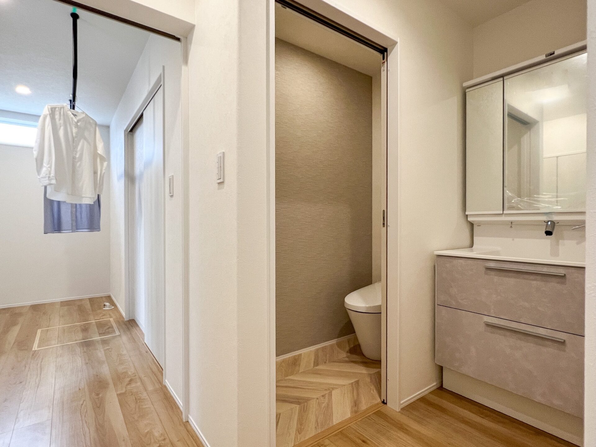 シューズクローゼット側の上がり口から直接アクセスできる洗面所&トイレ。