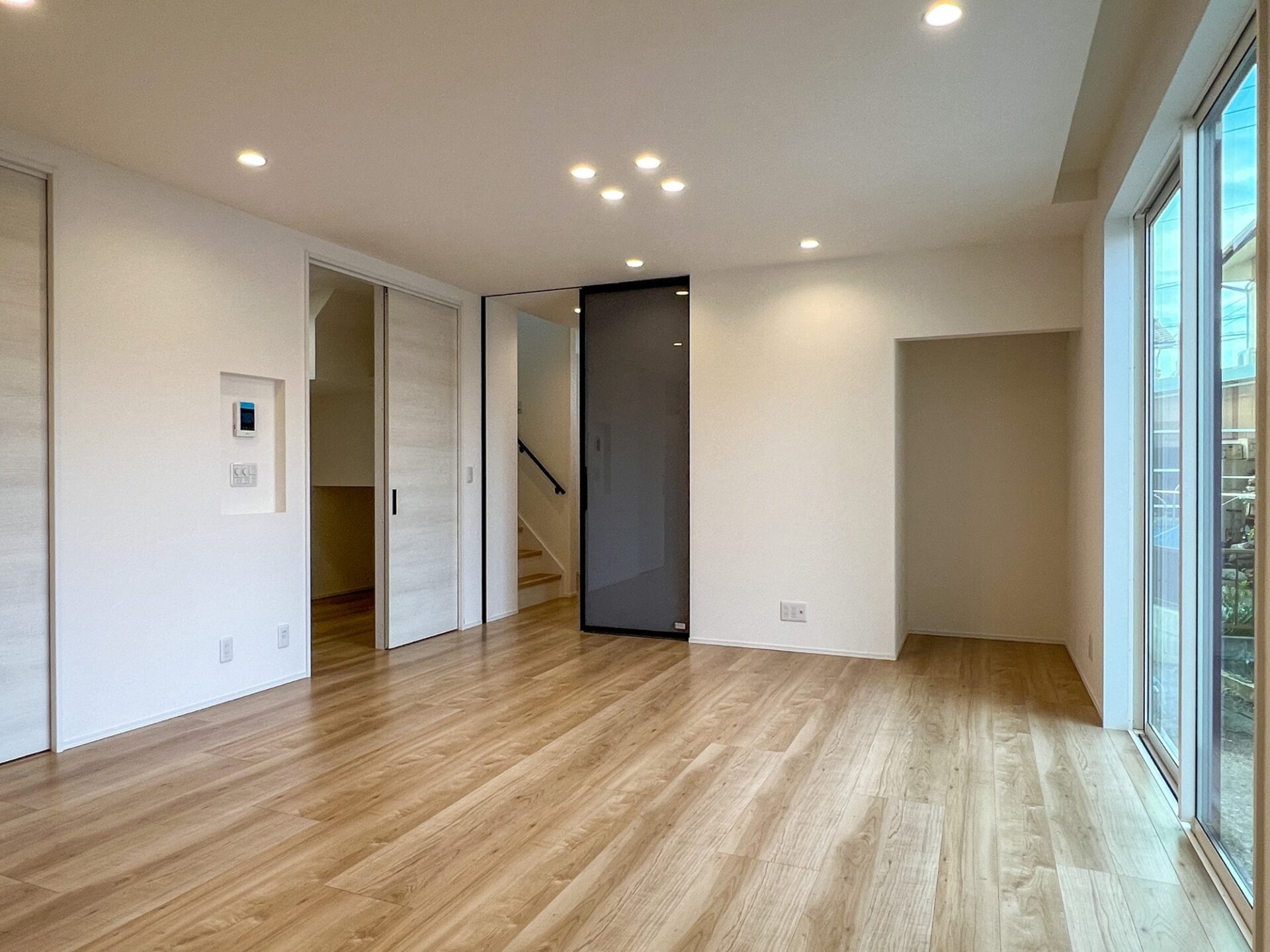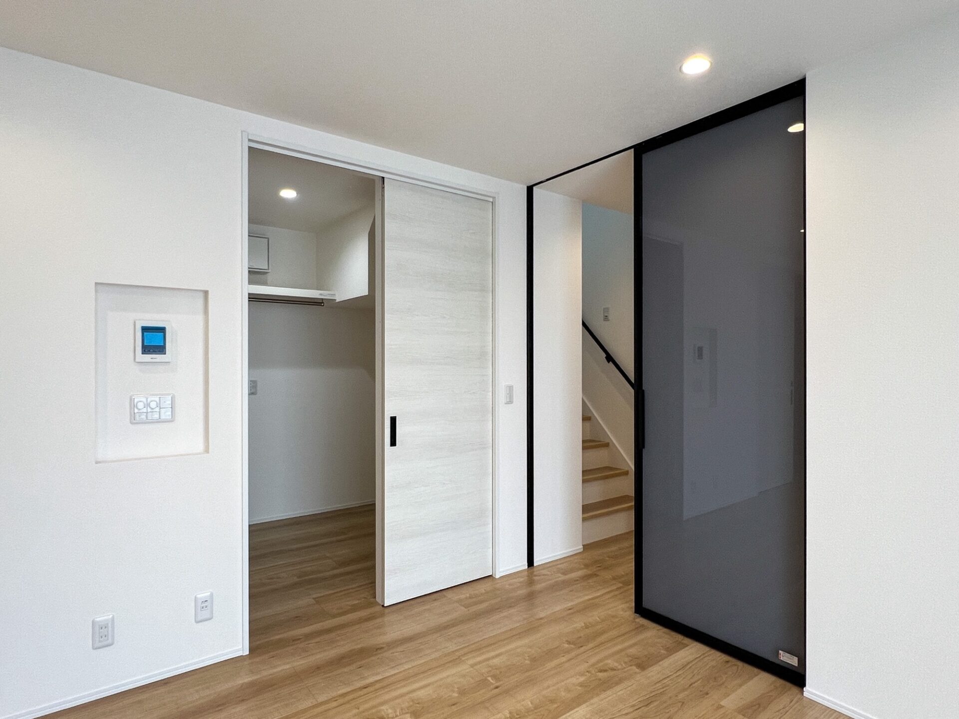 玄関からリビングへの入口は、おしゃれなブラックフレームのガラスドアを採用。