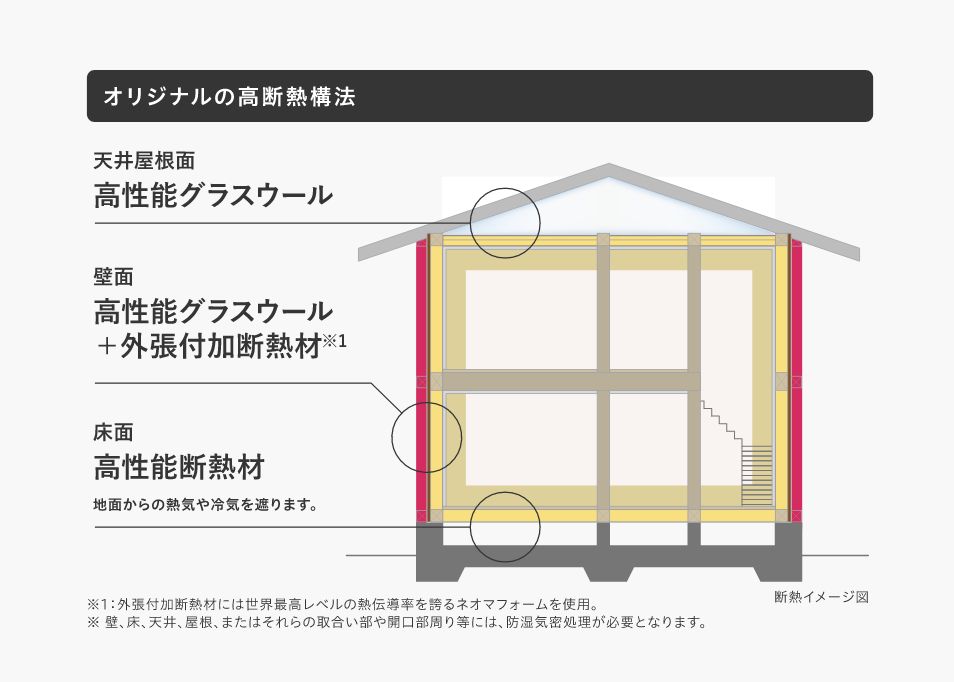 ネオマフォームは旭化成建材の素材を使用した断熱材で、経年劣化が極めて少なく、熱伝導率の低さはトップレベルの性能です。