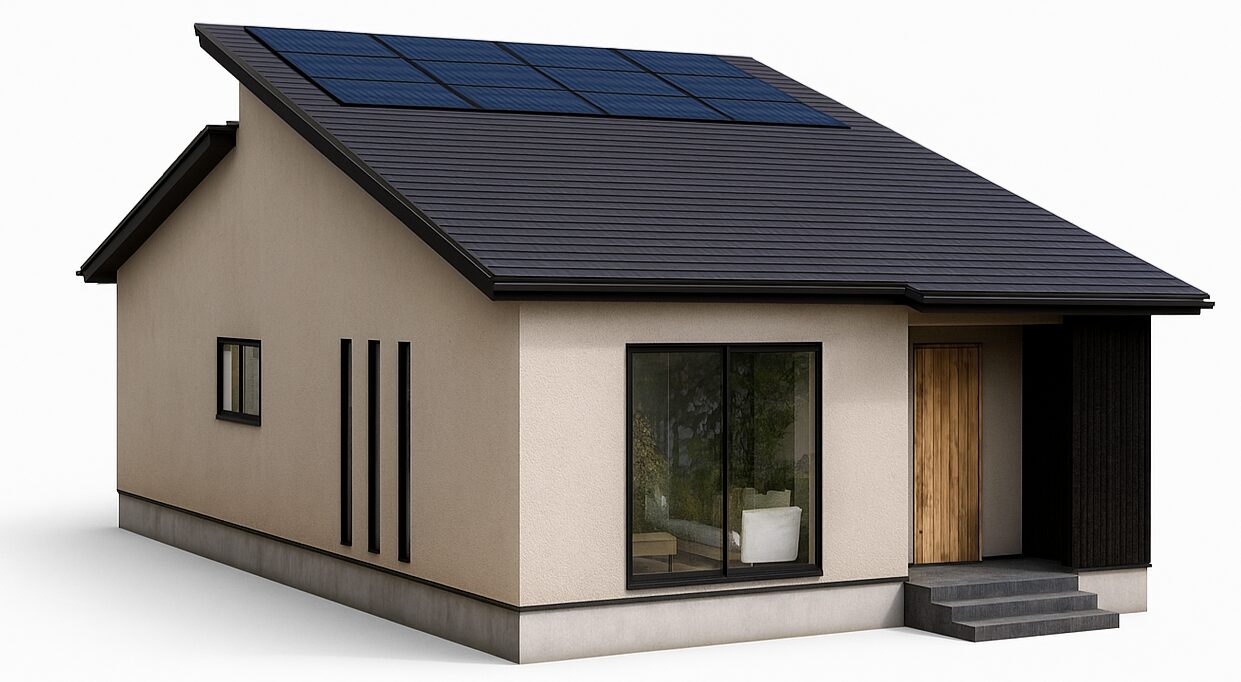 太陽光パネルを搭載、スリット窓、格子のアクセントがポイント!