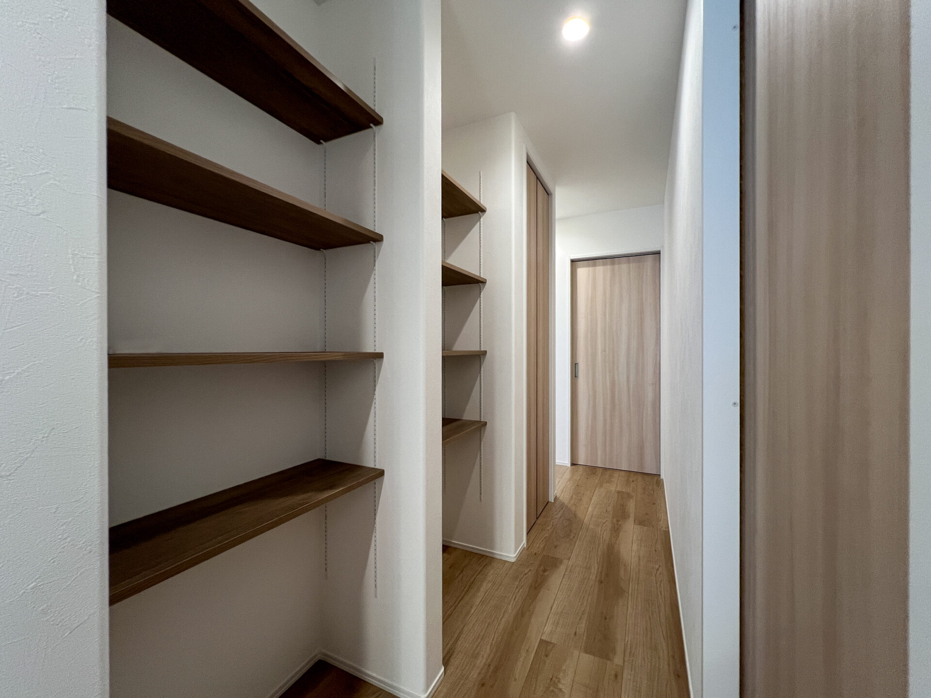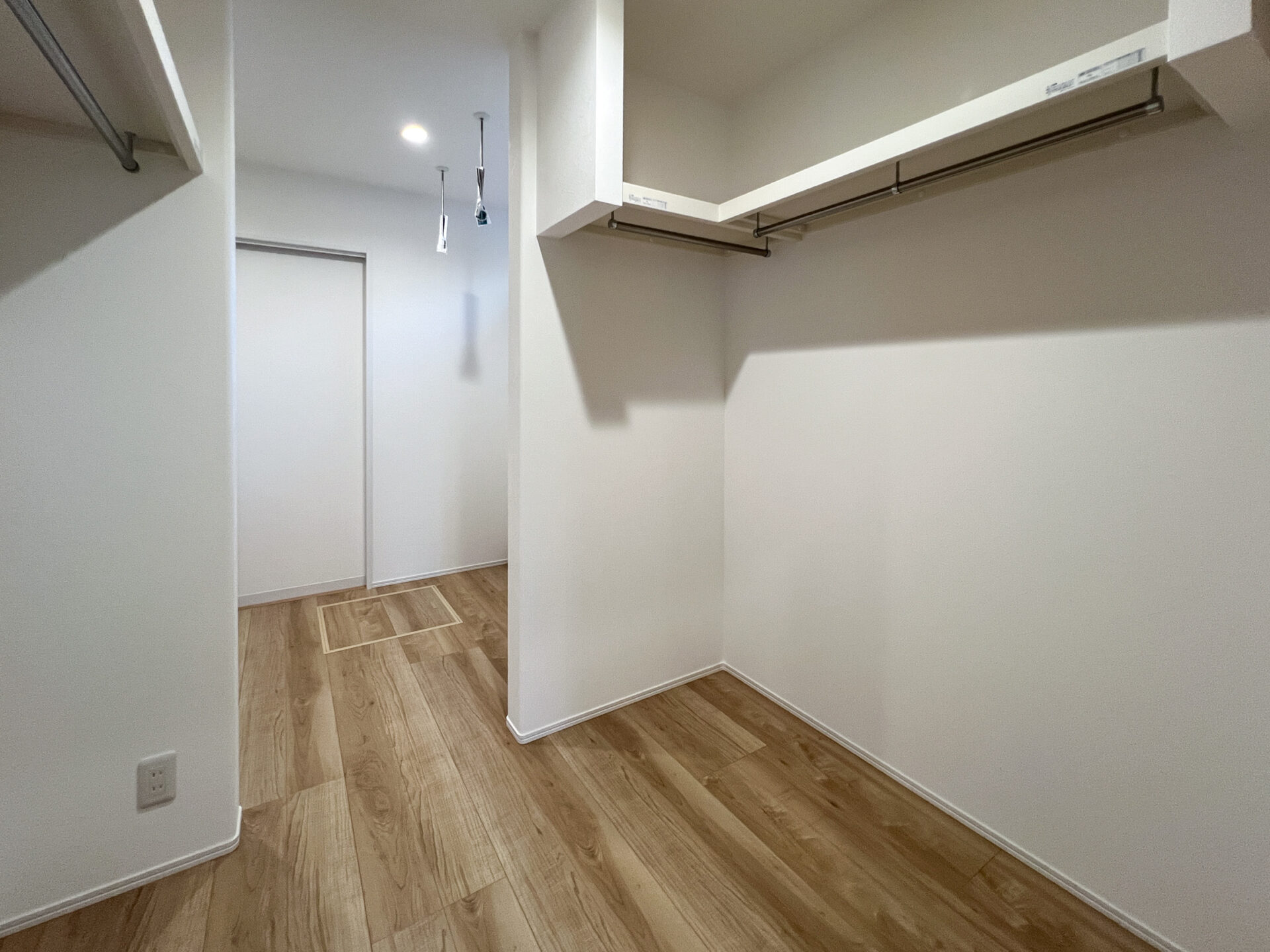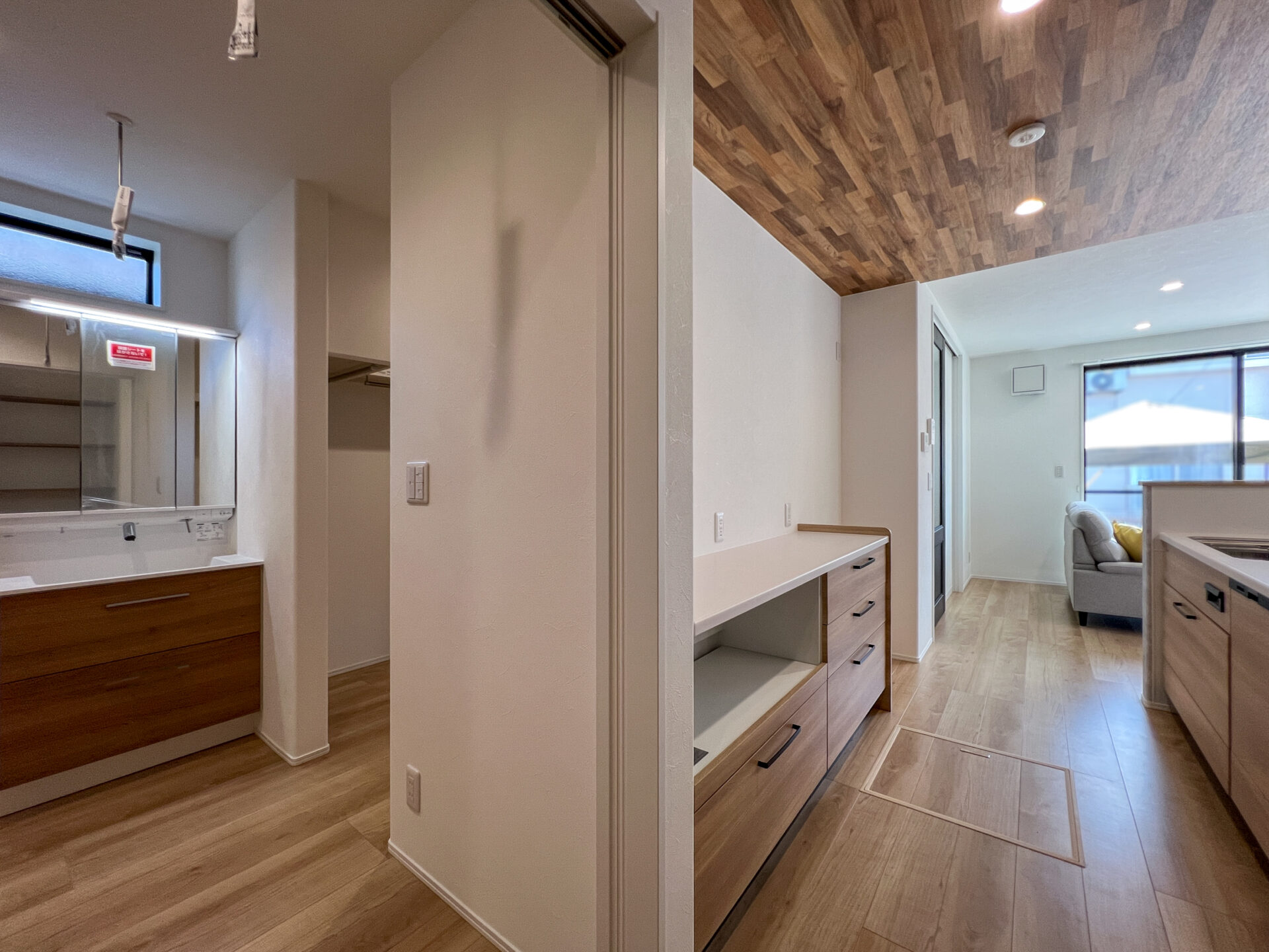 キッチン→ランドリールーム→脱衣室→浴室→ファミリークローゼットまでつながる、効率的な動線。