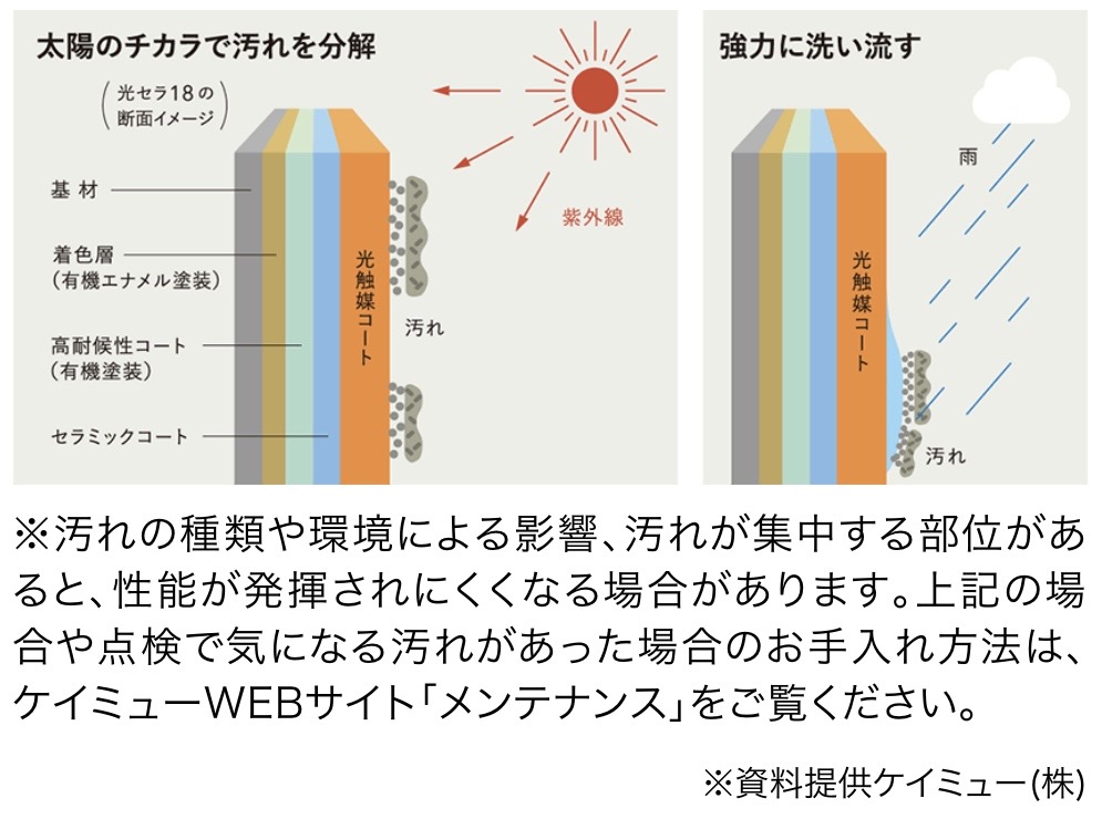 汚れを分解・洗い流す、光触媒の分解力365日お手入れ不要です。