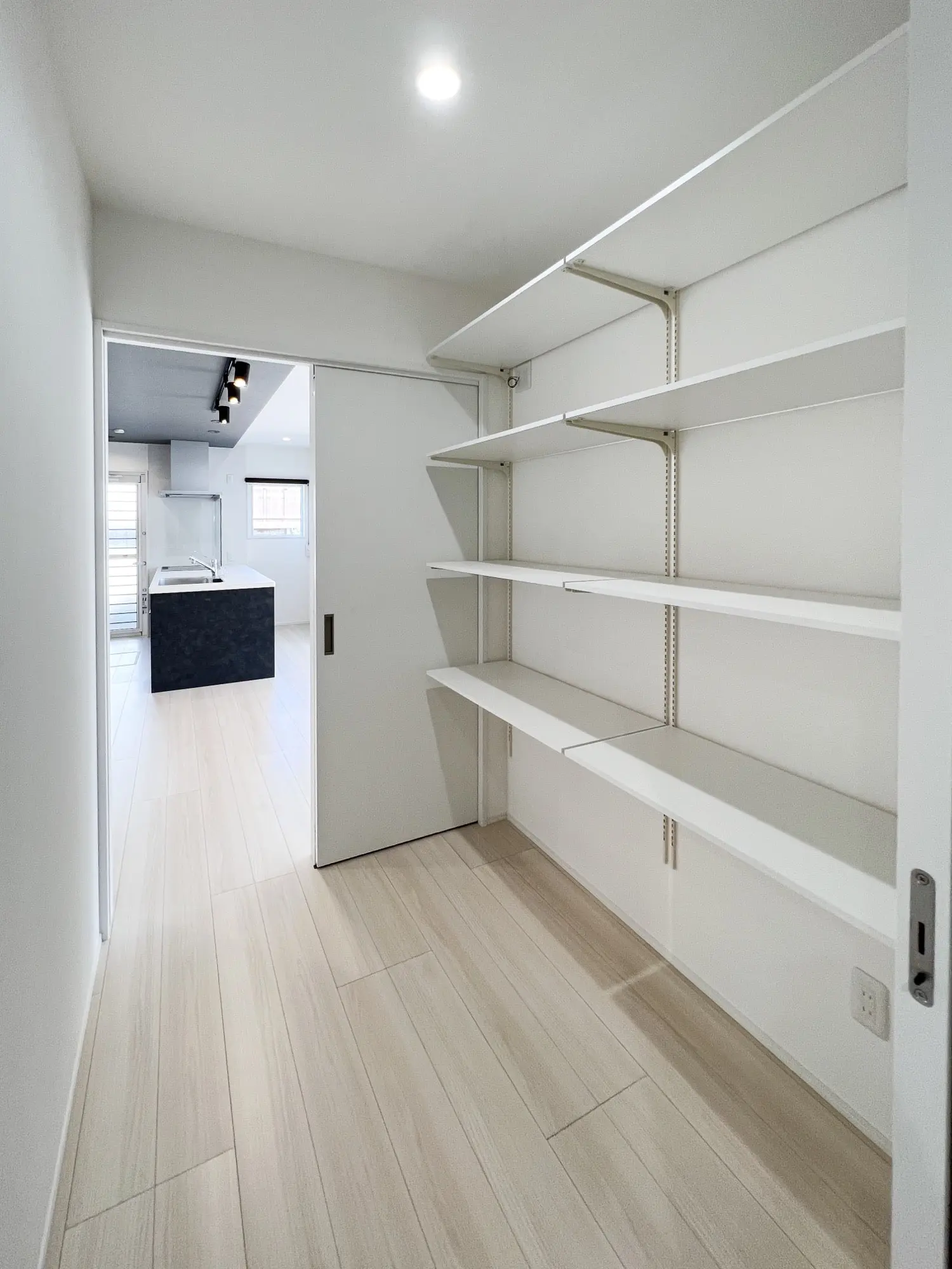 背面に全面をすっぽりと隠せる引き戸付きの大容量パントリーを。