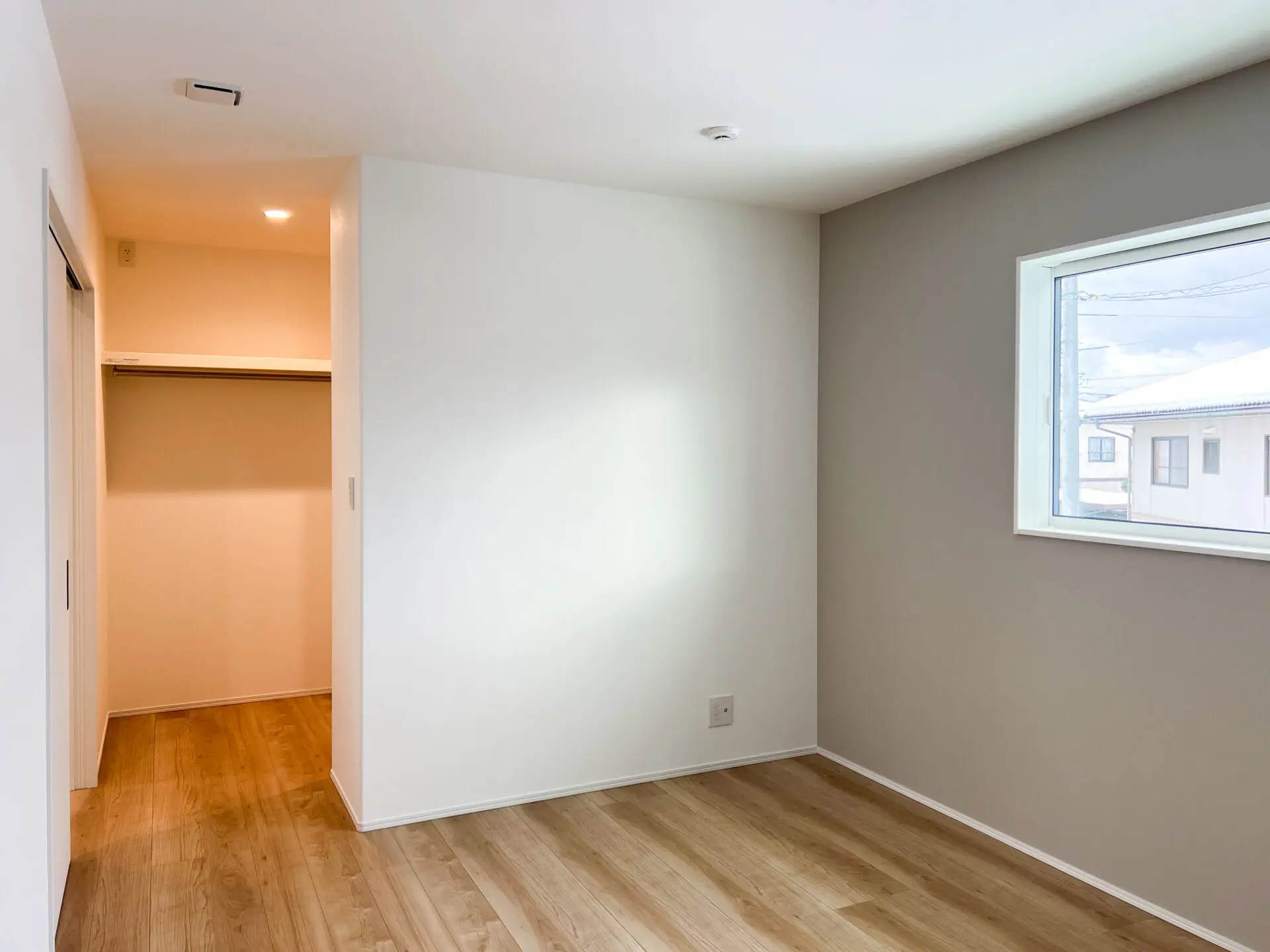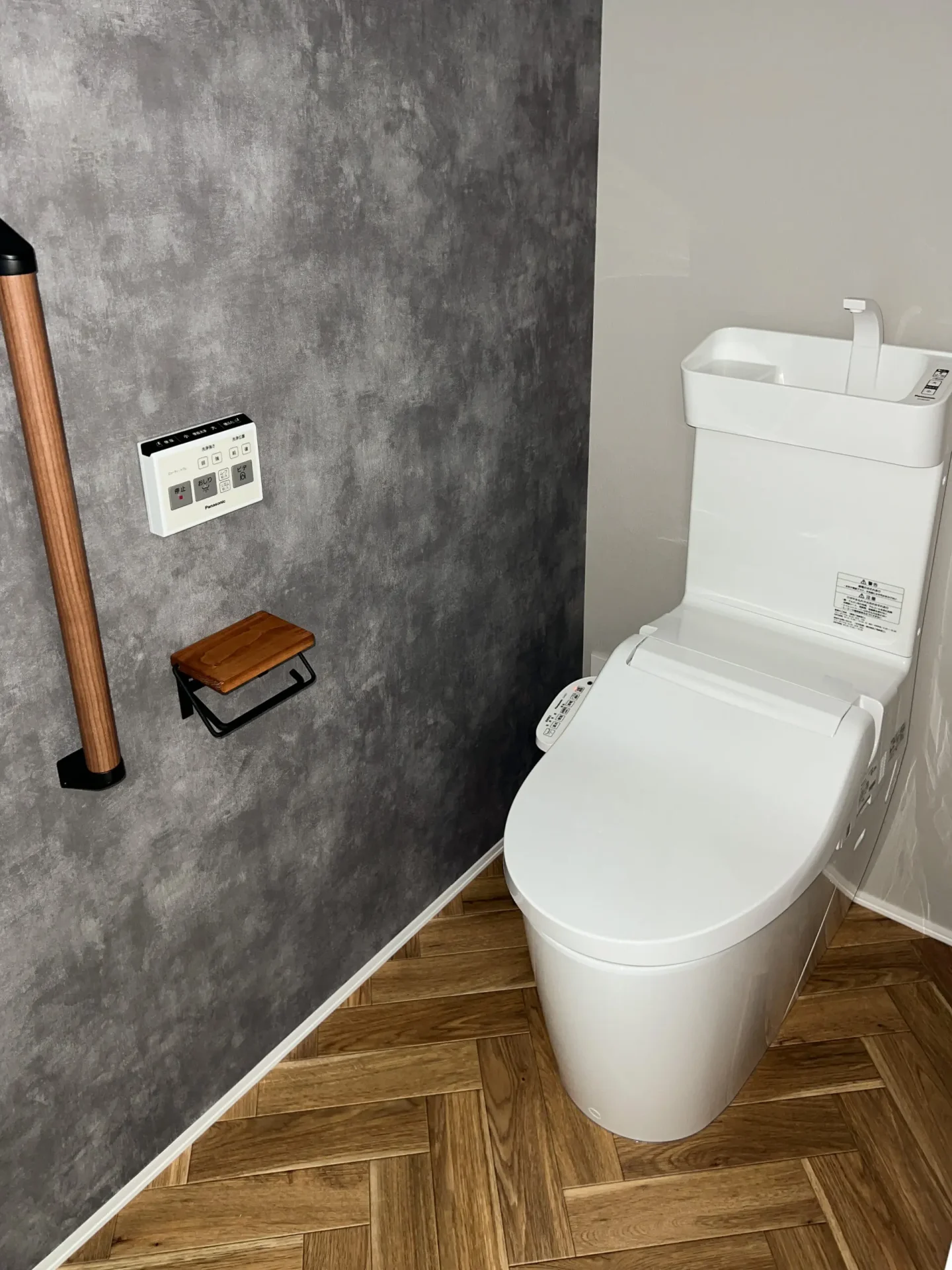 ヘリンボーン柄の床とグレーのアクセントクロスを採用しシックな雰囲気と遊び心を演出