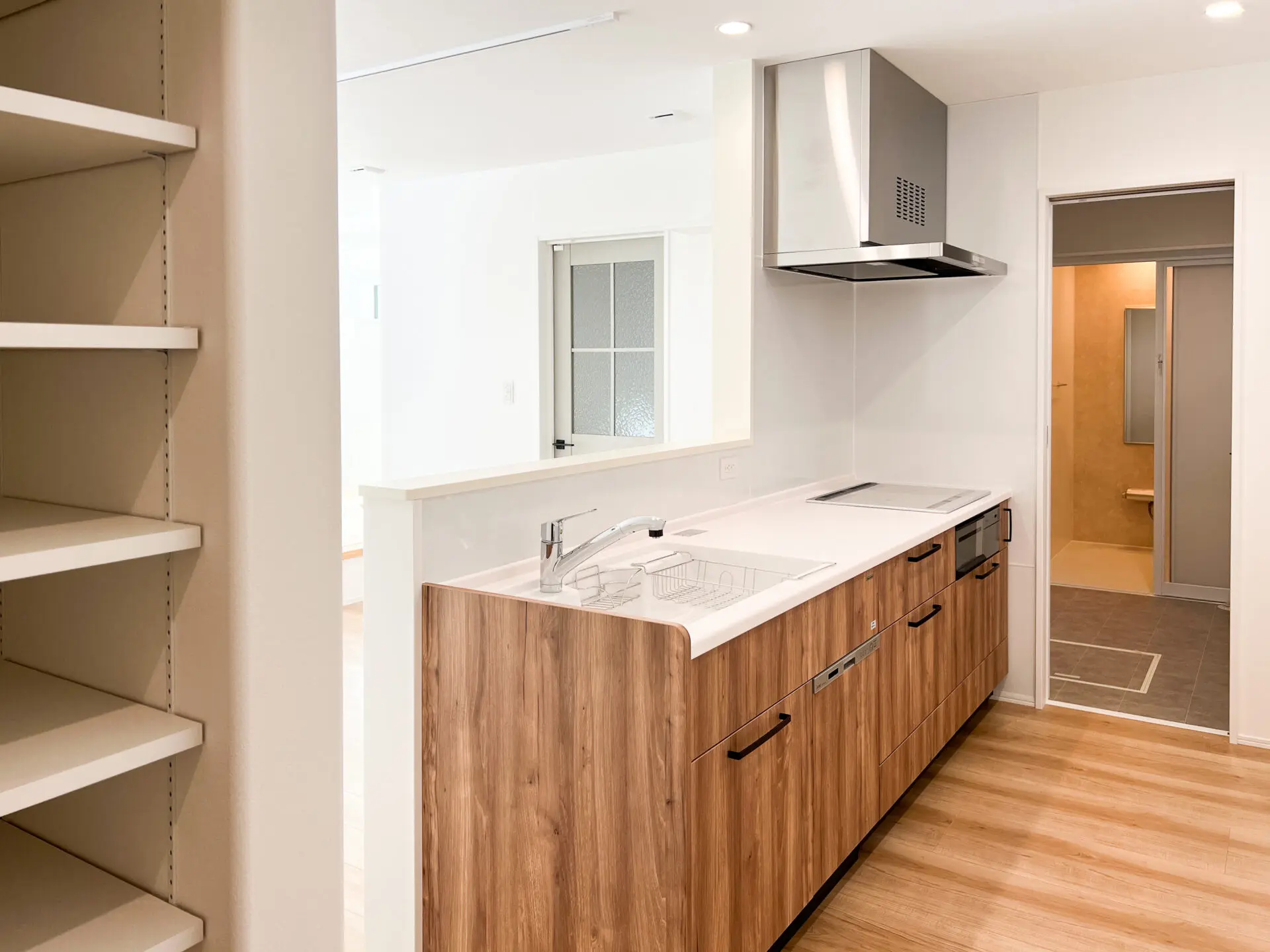 キッチンとユーティリティの行き来が便利な「家事ラク動線」や天気を気にせず洗濯物がたっぷり干せる広いユーティリティ、ストック食材の保管に便利なキッチン横収納は家事の強い味方に。