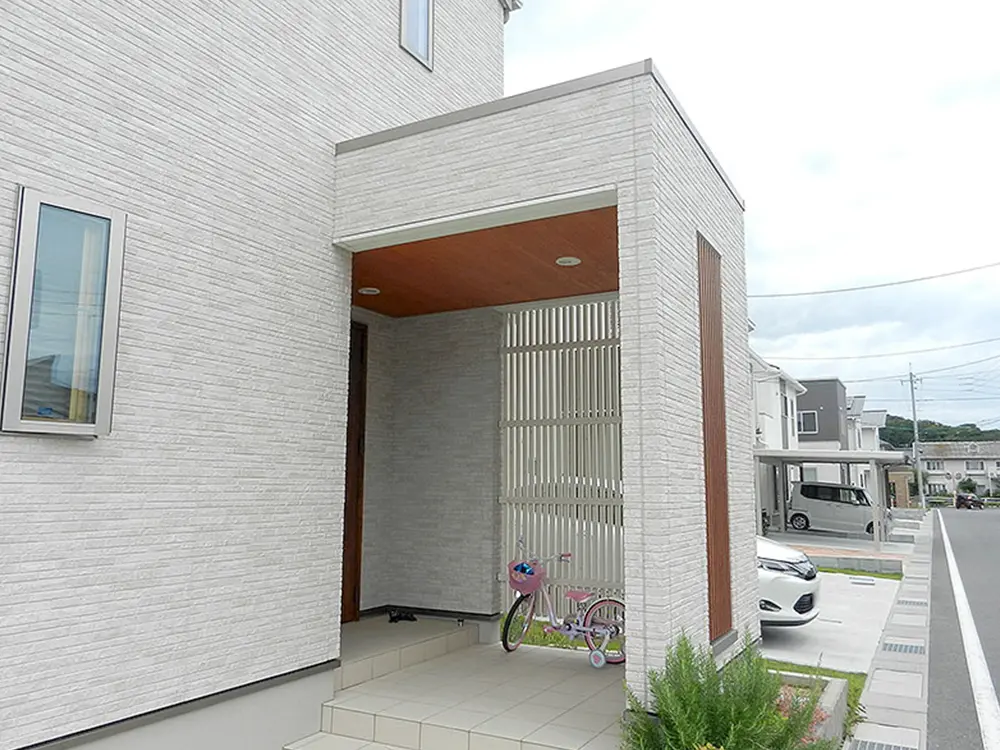 風通しの良いポーチは、屋根を設け、自転車も置けるようにしました。