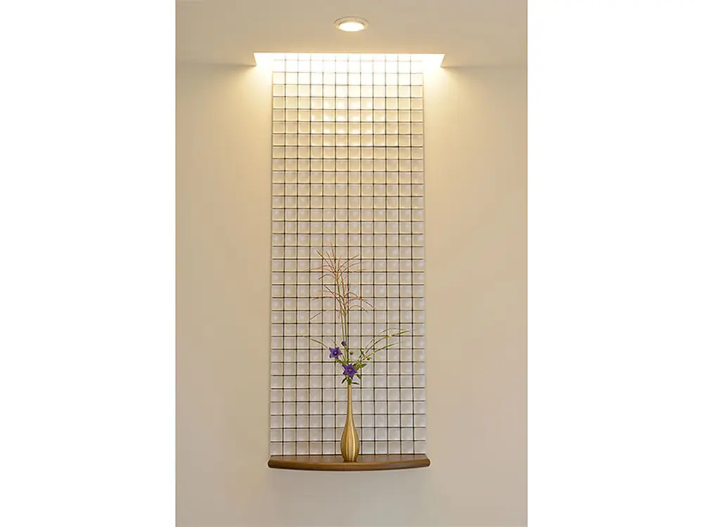 飾り棚は凹凸のあるタイルが光ります。