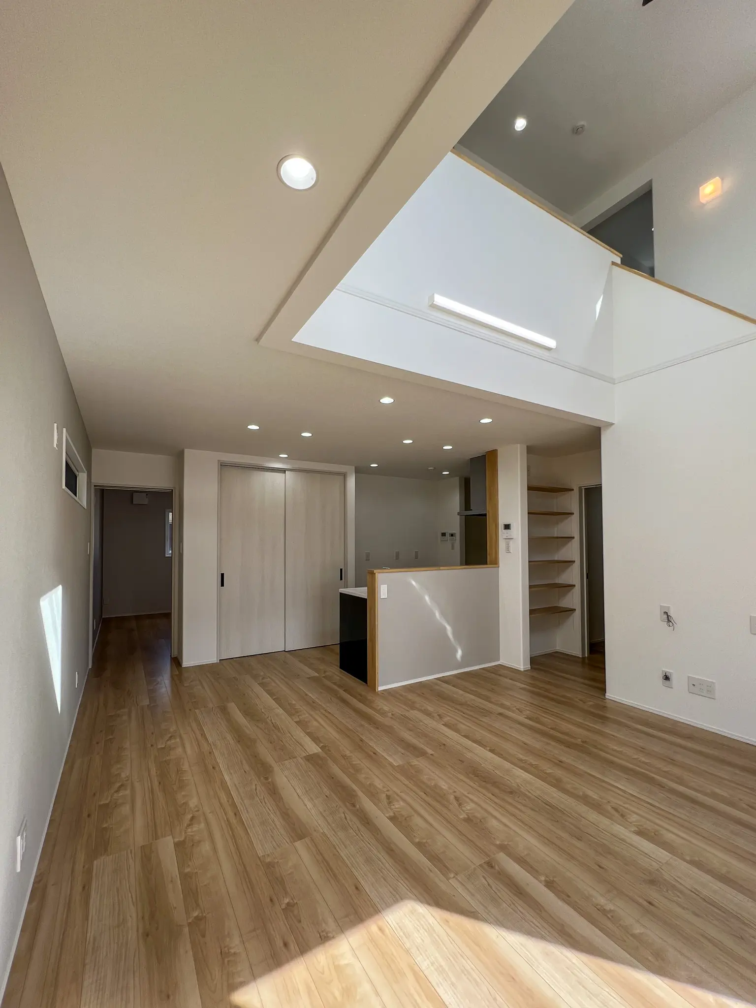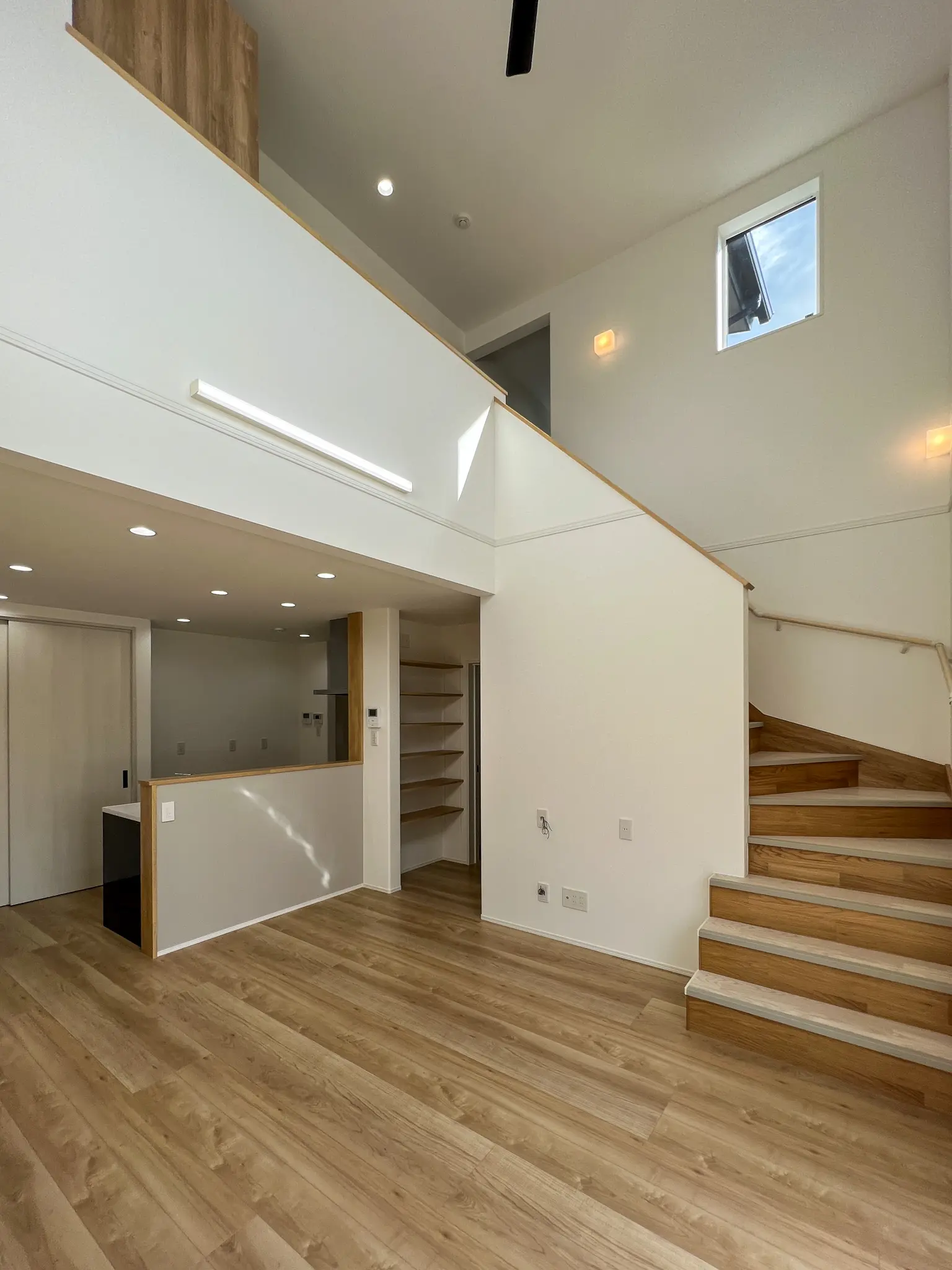 広い吹き抜けとリビング階段を一体にしたことでLDKは開放的な雰囲気に