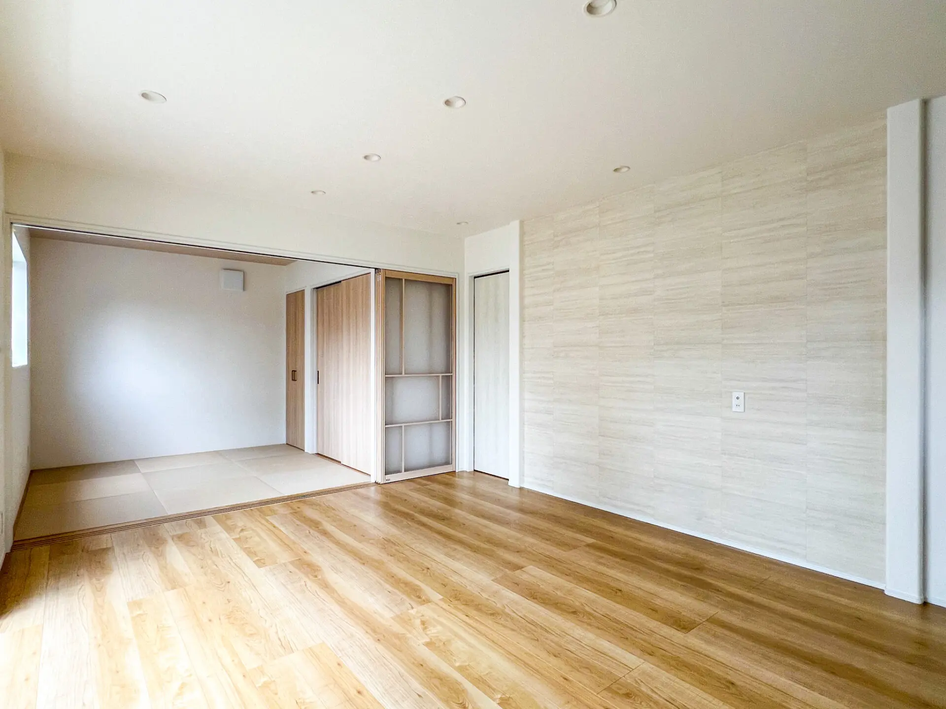 LDKと和室をひとつながりにすることで、空間の奥行き感がアップ!和室部分にもしっかり収納スペースを確保することで来客用のお布団やリビングで使うものがすっきり片付けられます。