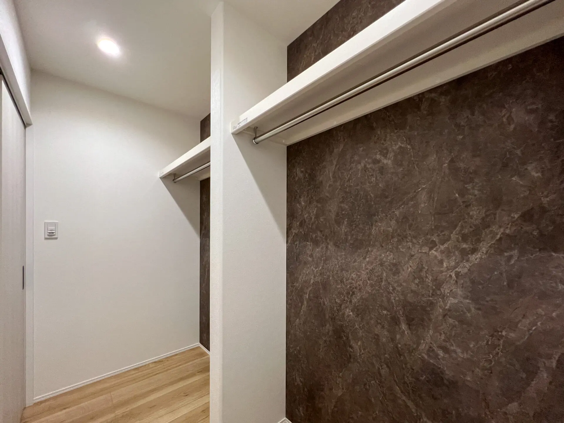 階段を上がってすぐという使いやすい位置には、大容量の収納を用意し、それとは別に約二畳の独立したウォークインクローゼットも完備。