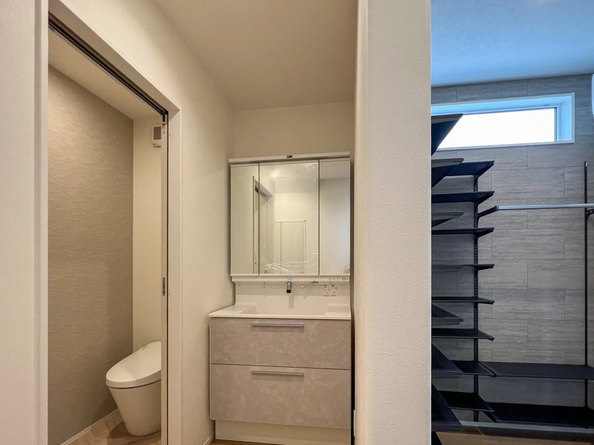 3Way動線①「玄関→洗面」シューズクローゼット側の上り口から直接アクセスできる洗面所&トイレは、お子さまの手洗いうがいの習慣作りにも◎