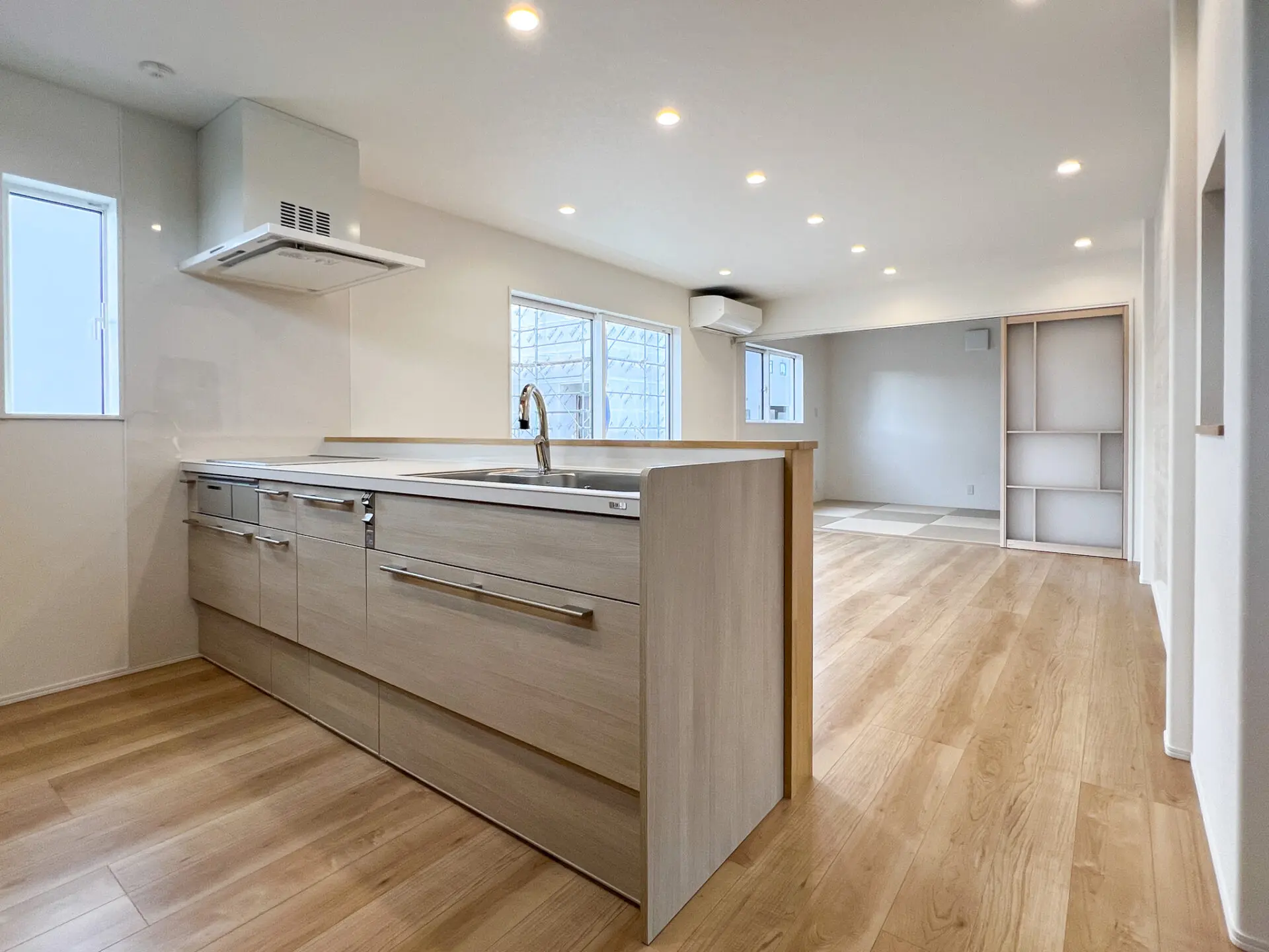 キッチンからは和室が見通せるので、料理をしながらでも和室で遊ぶ・お昼寝をするお子さまを見守れて安心です^^