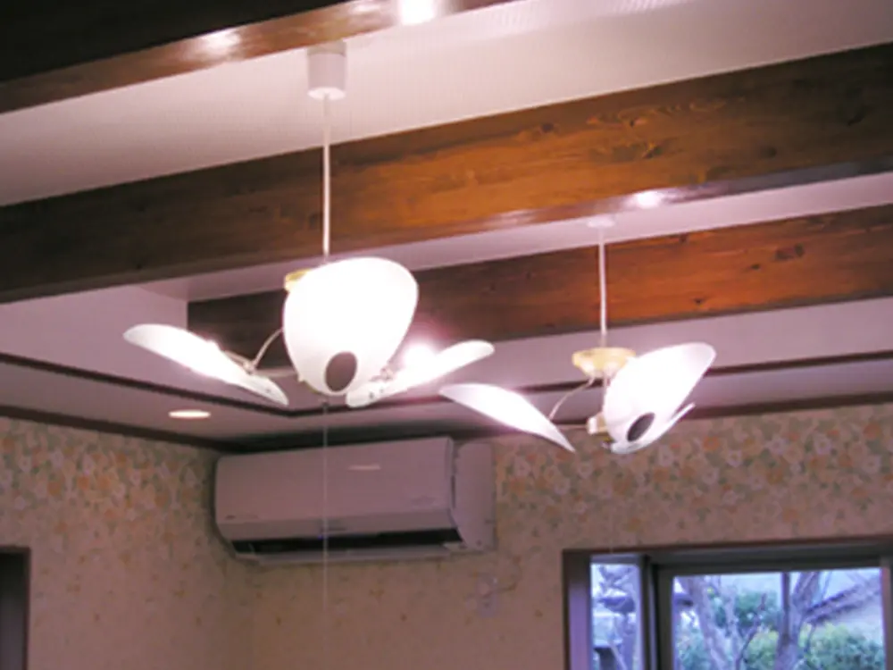 花びらのような照明とお花が降ってくるような壁の仕上げにしてあります。