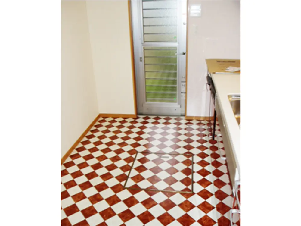 床は大柄なタイルのような仕上げにしました。流し台の色と同じ赤の色使いです。
