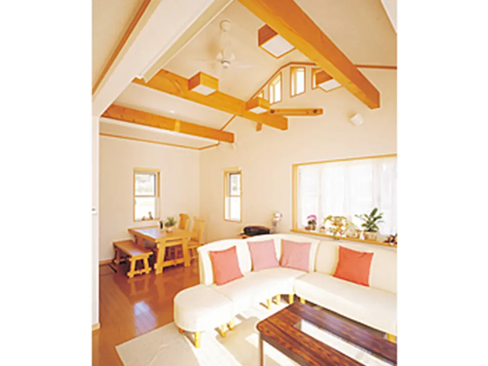 リビングは、梁を見せた勾配天井になっており、ロッジ風に仕上がりました。
