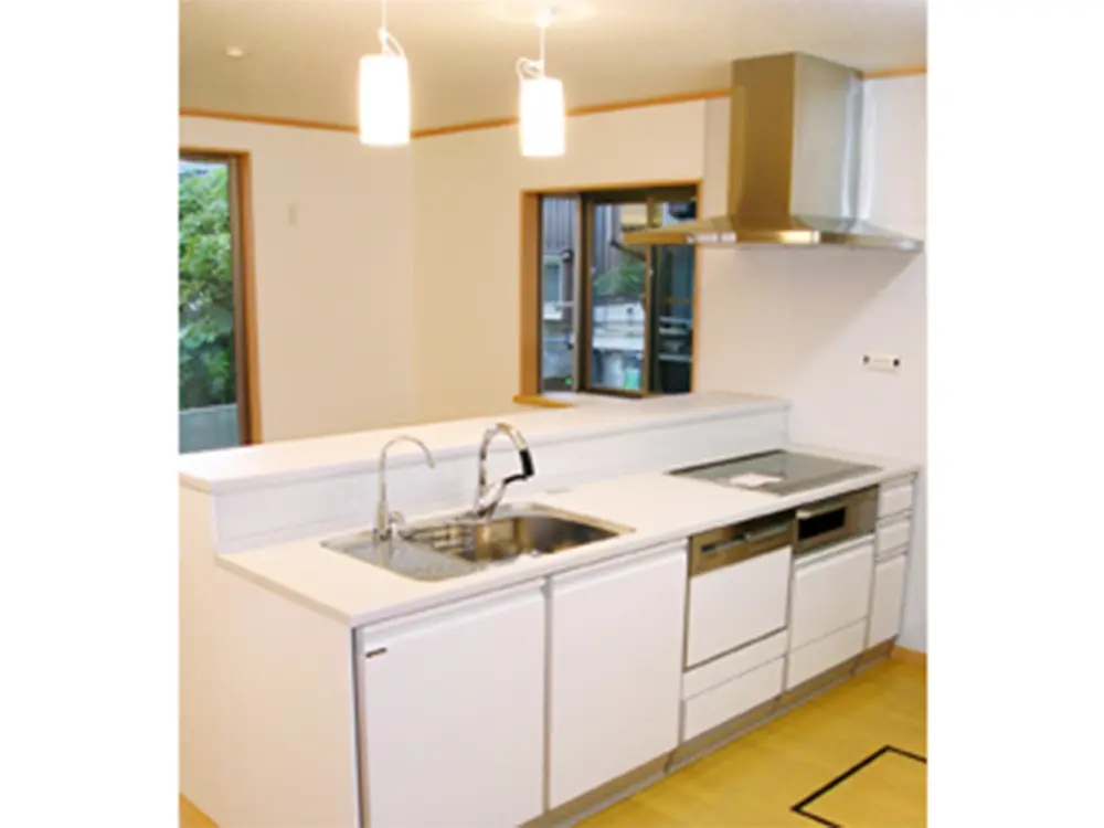 収納が一体となったオープンキッチンです。食洗器、浄水器もついた明るいカラーのおしゃれなキッチンです。