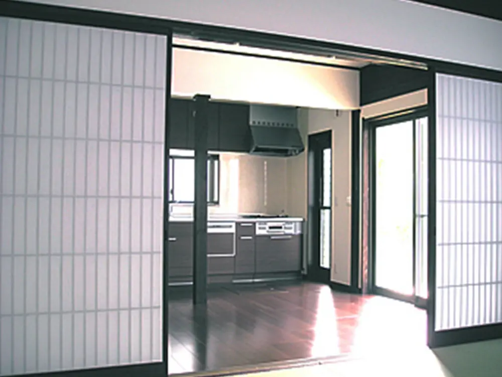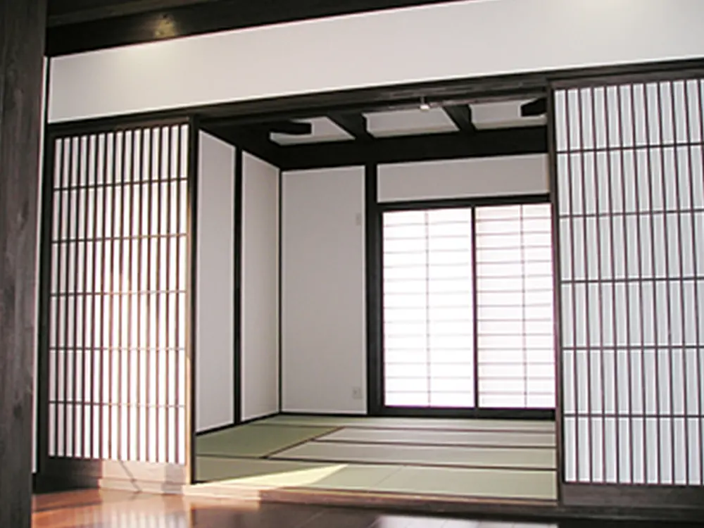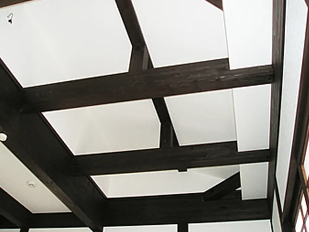懐かしい感じがする間仕切り障子。和室の天井は小屋組みを見せています。