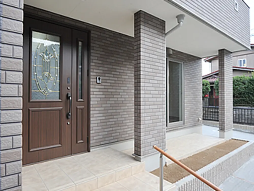 玄関はカードキーで開閉。バルコニーの下は段数の少ないアプローチになっています。